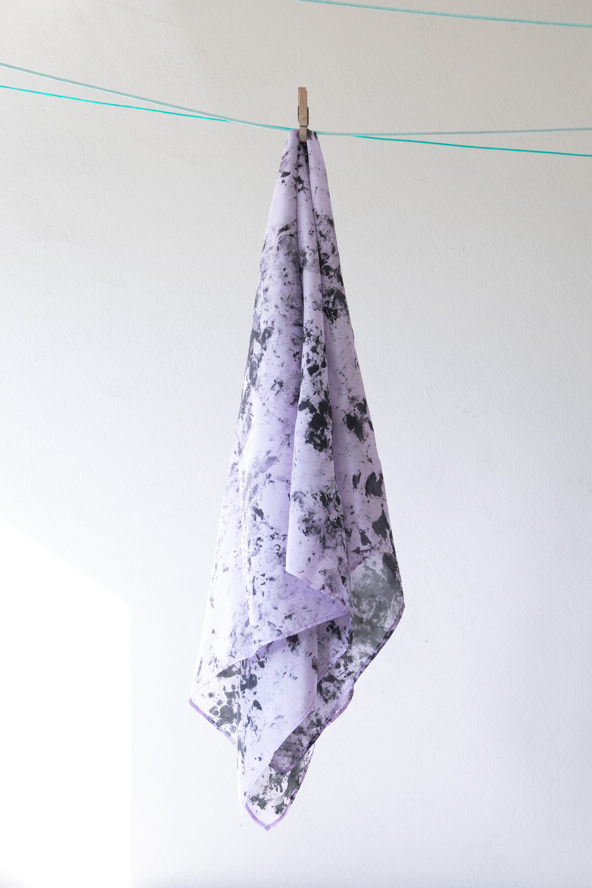 Þegar ég lærði að prenta á efni notaði ég alltaf hefðbundna ramma. Hins vegar heillaðist ég af tilviljunarkennda mynstrinu sem myndaðist á klútnum mínum þegar ég þurrkaði mér um hendurnar. Ég þróaði sérstaka aðferð til að yfirfæra þetta mynstur í mína eigin hönnun. Kosturinn við þessa aðferð er að mynstrið verður aldrei nákvæmlega eins á hverri slæðu, sem gerir hvert eintak einstakt og ólíkt öðrum.